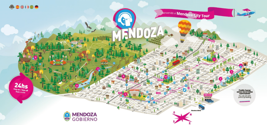 Las entradas pueden comprarse en el siguiente enlace: https://mendozacitytour.com/ticket-online.html. El recorrido está desde las 10 AM hasta las 17 PM. Para todos aquellos que no sean hispanoablantes, el servicio permite escoger hasta 4 idiomas (inglés, francés alemán y portugués).