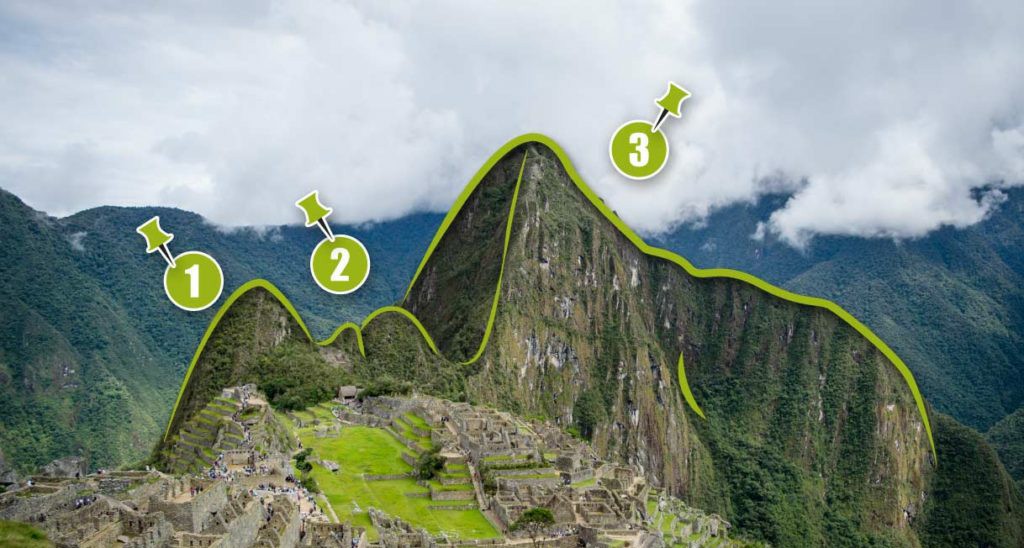 La primera montaña (N°1) forma la silueta de la barbilla del inca. Si seguimos observando vamos a poder ver la boca del rostro, formada por las montañas menores, es decir, la segunda (N°2). Finalmente, si miramos la tercera. (N°3), vamos a ver la nariz, los ojos y parte de la cabeza del inca.