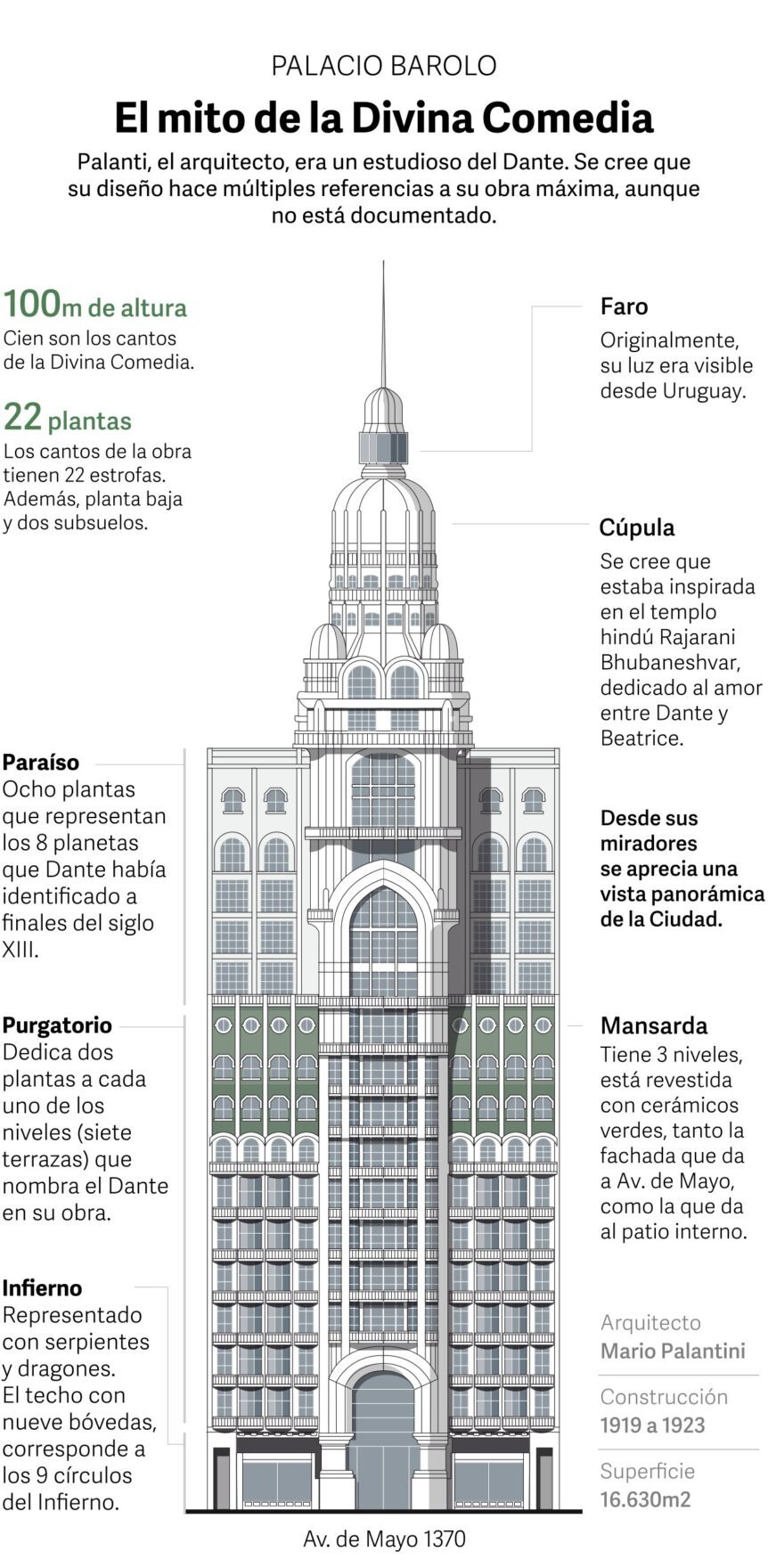 Su creación tiene una historia interesante, ya que se cuenta que su creador, Mario Palanti, se inspiró en los versos de la Divina Comedia de Dante Alighieri para diseñarlo. Uno de los «hermanos» de la construcción se encuentra muy cerca de la Capital Federal, ya que el Palacio Salvo, ubicado en Uruguay, es un referente de la arquitectura esotérica latinoamericana y en su estructura se advierten múltiples referencias directas a la gran obra de Dante.
