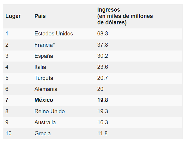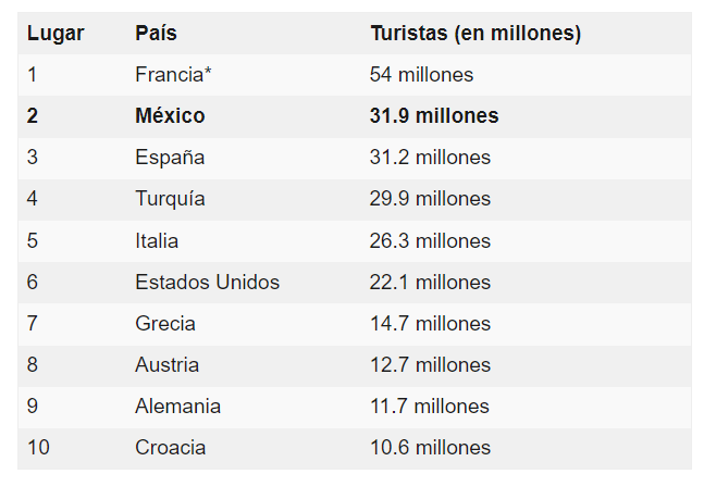 La lista fue publicada por la Organización Mundial de Turismo (UNWTO en inglés). A los clásicos destinos europeos como Francia e Italia se les sumó un país latinoamericano que logró colocarse en una de las posiciones más altas. Estados Unidos quedó en la sexta posición