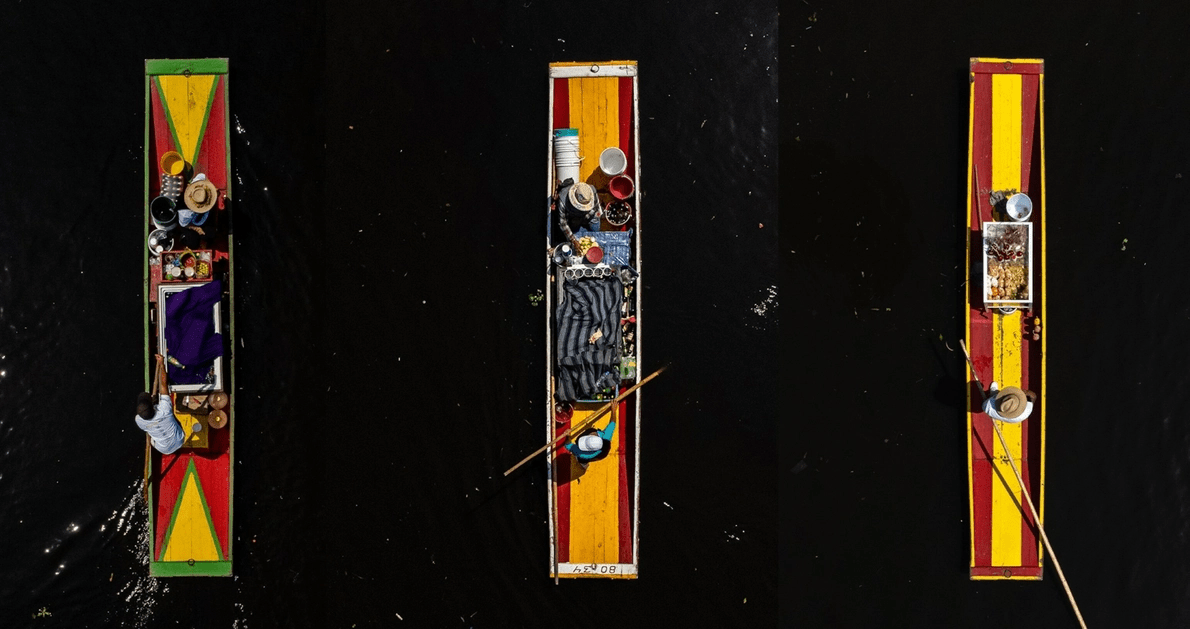 Los vendedores de comida en coloridos botes turísticos conocidos como trajineras ofrecen sus productos a los visitantes en Xochimilco, un distrito de humedales de la UNESCO en el sur de la Ciudad de México.