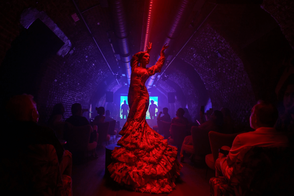 Alba Heredia, bailarina granadina, actúa en el Tablao Flamenco la Carmela de Madrid. El flamenco, originario de Andalucía hace aproximadamente un milenio, se ha convertido en una forma de arte semi-improvisada de percusión, canto quejumbroso y ráfagas de guitarra acústica.