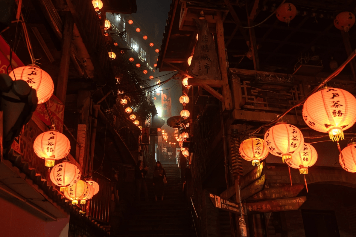Las callecitas de Juifen, una aldea de montaña junto al mar a 90 minutos de Taipéi, la capital taiwanesa, cobran vida en el resplandor de la luz de la linterna.
