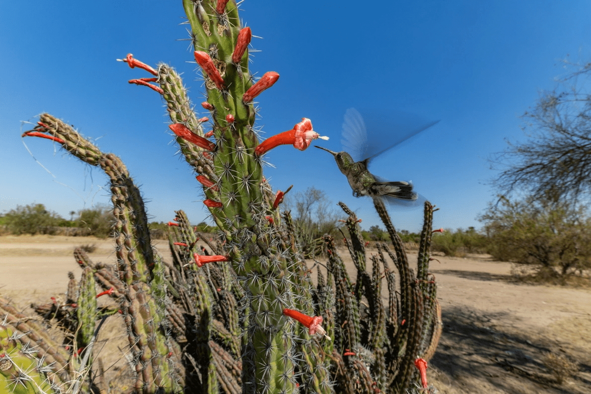 Un colibrí recoge néctar de una flor de cactus cerca de Hermosillo, México. En la mitología azteca, el ave más pequeña del mundo representa al Dios sol Huitzilopochtli.