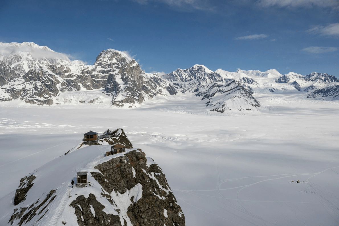 Sheldon Chalet, refugio al que solo se puede acceder en helicóptero, se alza a 1773 metros sobre la Gran Garganta del Glaciar Ruth. El Parque Nacional Denali y la Reserva de Alaska ofrecen oportunidades para grandes aventuras, desde acampar en el campo hasta el montañismo