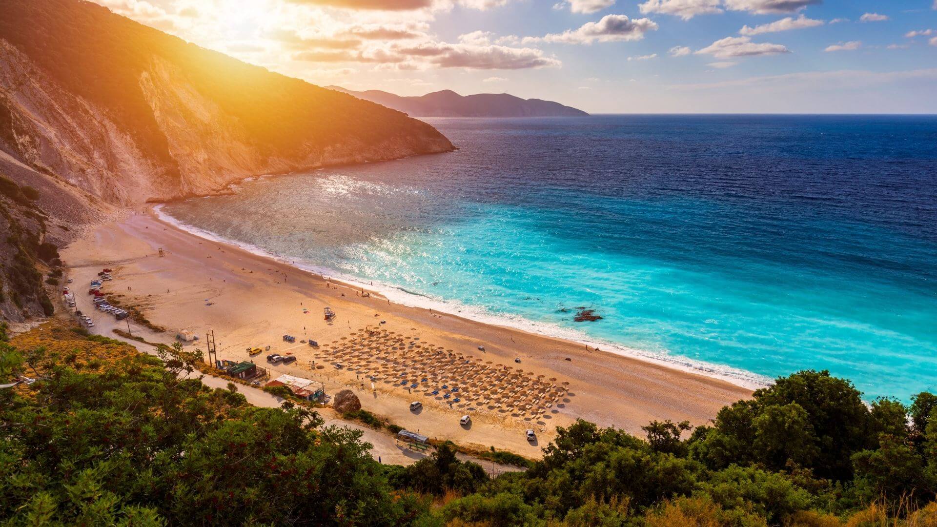 En la Isla de Cefalonía, más precisamente en la península de Paliki, se ubica esta playa de cuatro kilómetros de extensión. Las aguas calmas y poco profundas del lugar invitan a relajarse mientras se disfruta la belleza de la arena naranja de la playa.