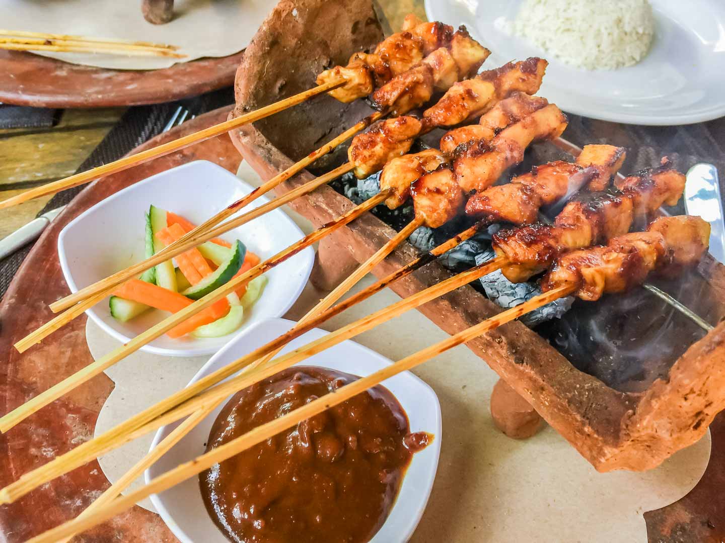 - Satay: Son rebanadas de pollo, cabra, ternera o cerdo a la parrilla, ensartadas en palitos. Pueden encontrarse en prácticamente todas las ciudades de Indonesia; cada cultura tiene una toma y una variación únicas. Sate lilit es una creación de Bali que se marina en leche de coco y otras especias.