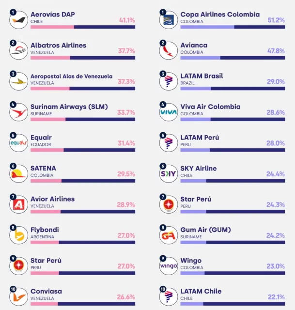 A la hora de referirnos a Sudamérica, los resultados mostraron que los viajeros colocan a Aerovías DAP, de Chile, como la favorita de la región, mientras que Copa Airlines, de Colombia, fue la que obtuvo las reseñas más negativas.