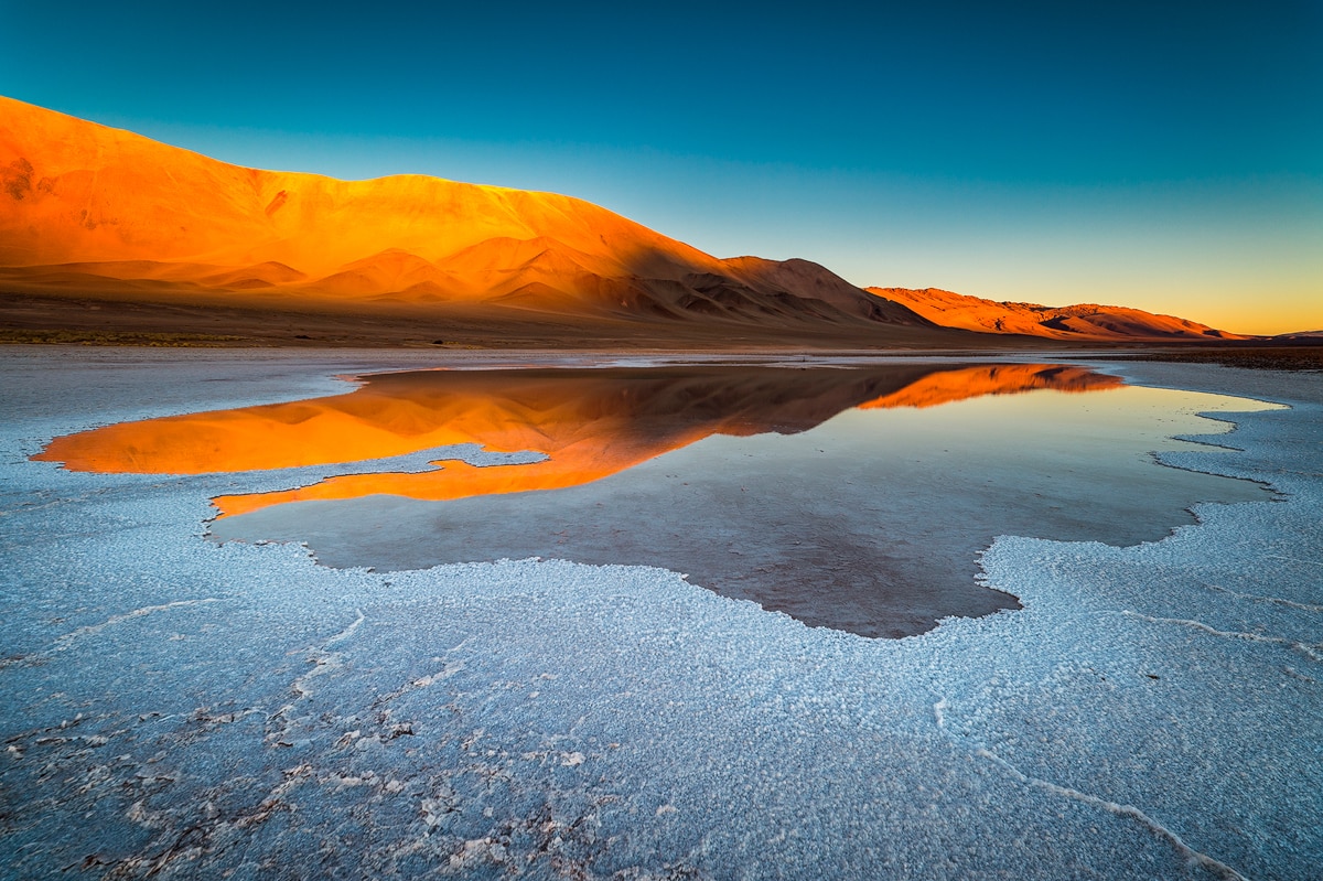 Las Salinas Grandes se cubren de agua en temporada de lluvias y el color turquesa crea un escenario increíble. Recorrer los caminos internos de este desierto de sal a 3.450 metros sobre el nivel del mar ofrece postales inolvidables.